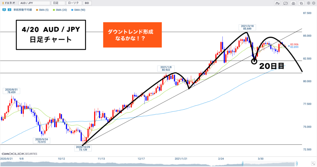 前回のサイクル高値を超えることはなく、早い段階で84.410の高値をつけているのでここが天井だとすればレフトトランスレーション確定となるのでショートの戦略が活きてきます。
