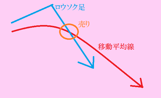 移動平均線が上昇後、横ばいになるか下落しつつある局面で、ロウソク足が移動平均線を上から下にクロス。