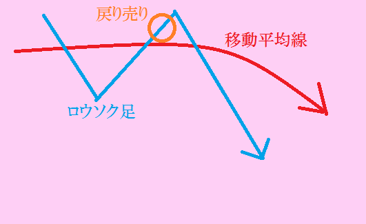 ロウソク足が下落する移動平均線の下にあり、移動平均線に向けて上昇するもクロスせずに下落。