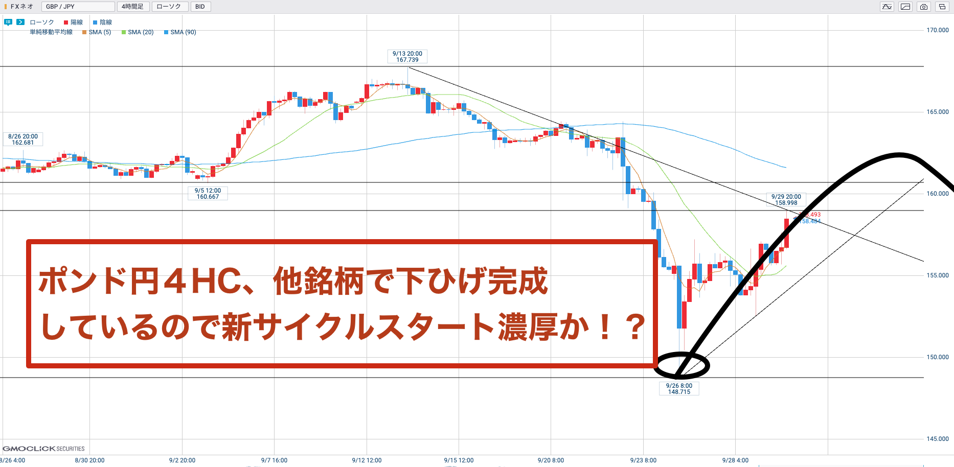 豪ドル円・ニュージーランド円ともに下髭完成したので、画像ポンド円に関しては新サイクルスタートの可能性がさらに高くなっていると見ています。