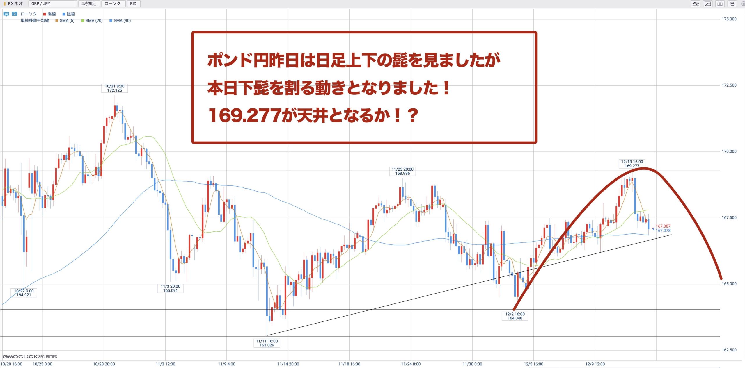 なので4H C天井を45本目の高値、169.277が天井になる可能性が高くなりましたね♪