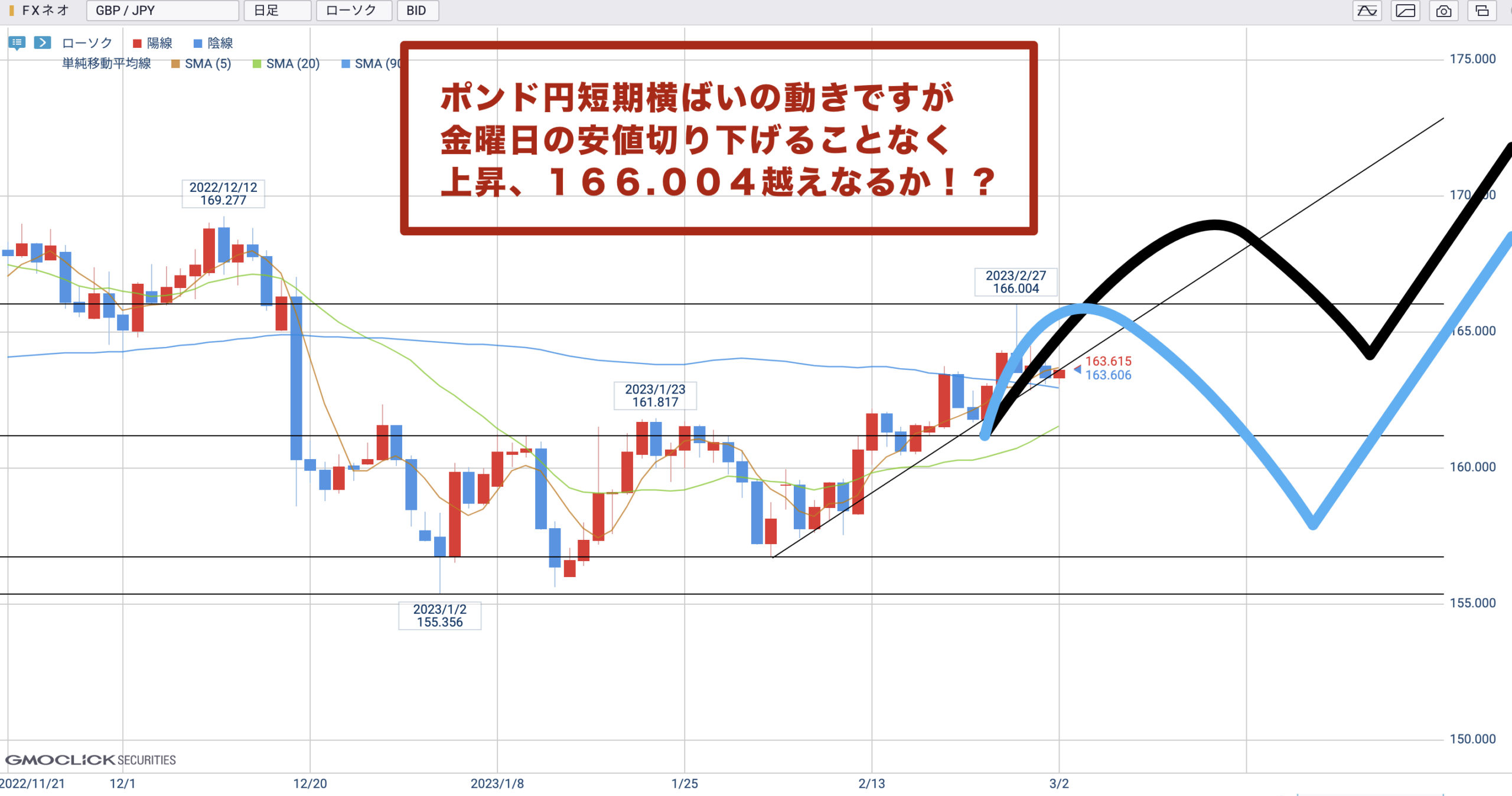 画像ポンド円は日足チャート、若干のした髭が出ているので月曜日は上昇を意識していますが、一概には言えません。