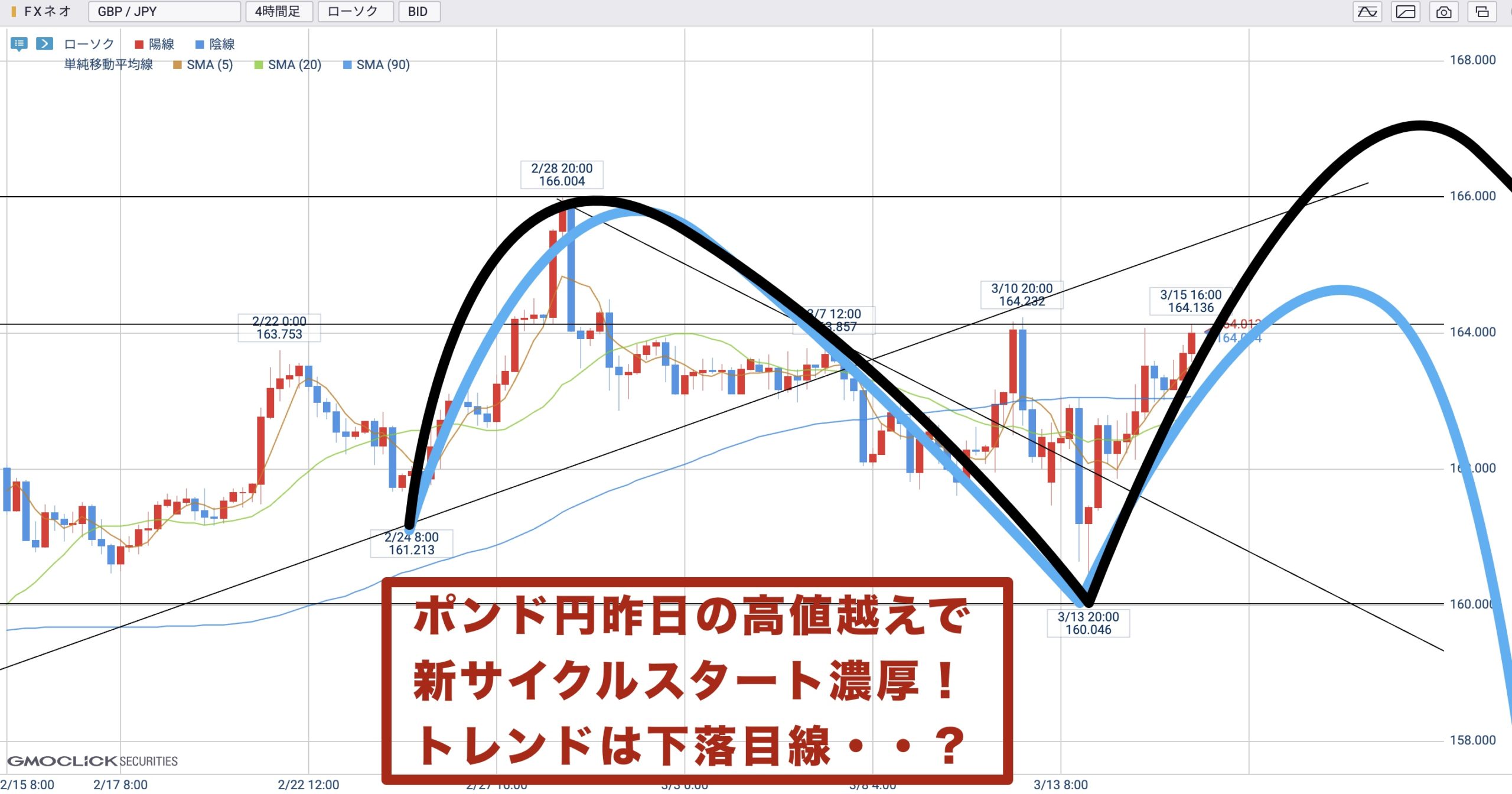 画像ポンド円4時間足チャートは 直近高値164.136 を本日つけています。