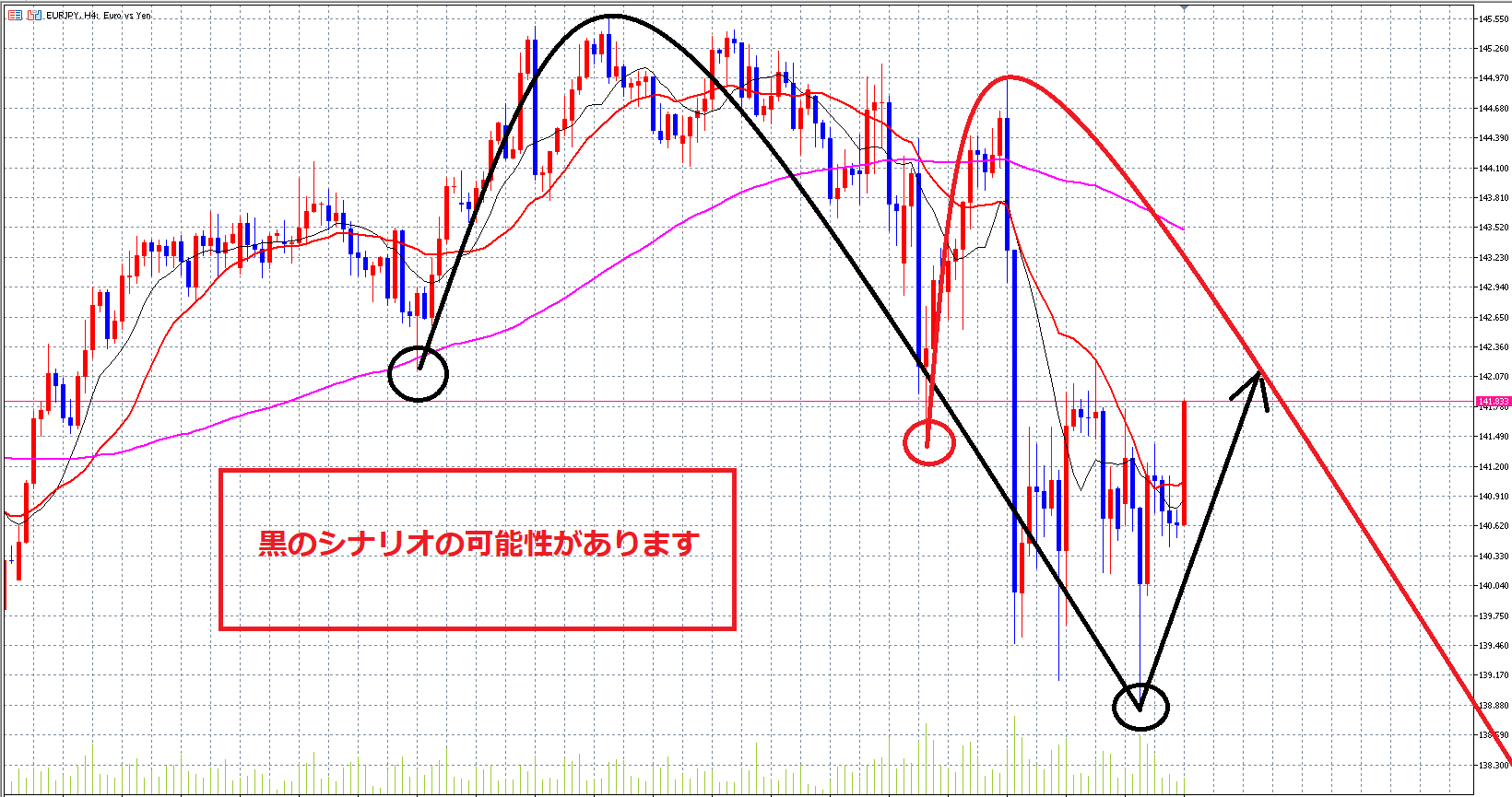 昨日、日足下ヒゲ完成しているので、黒のシナリオの可能性があります。