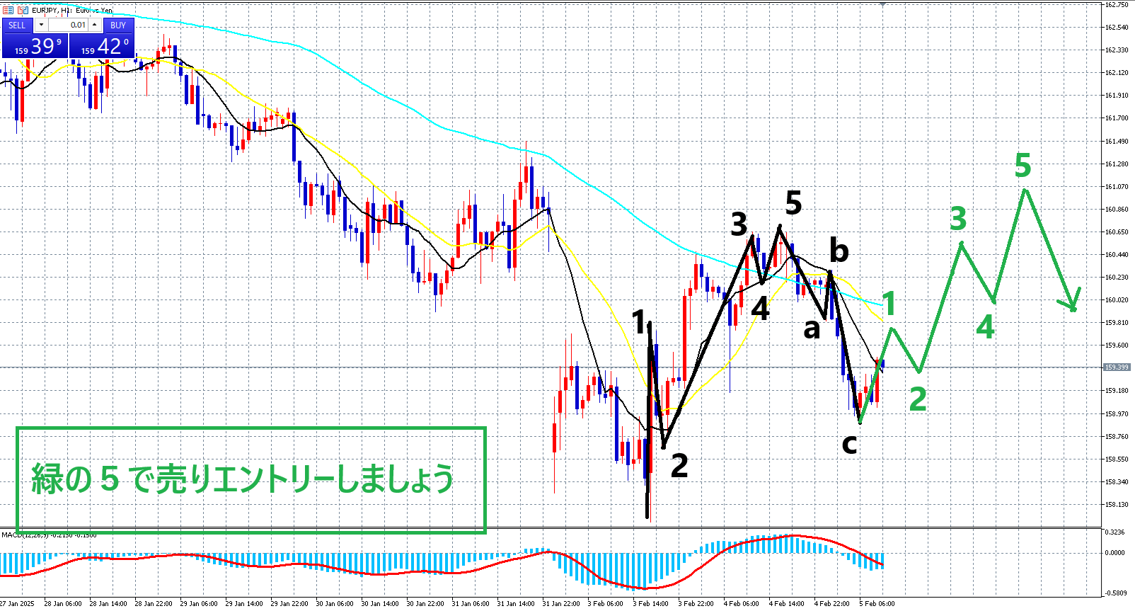 4時間はc波形成中です。(もしかしたら、すでに1波目に入っている可能性もある。この場合続落していきます:サブシナリオ)