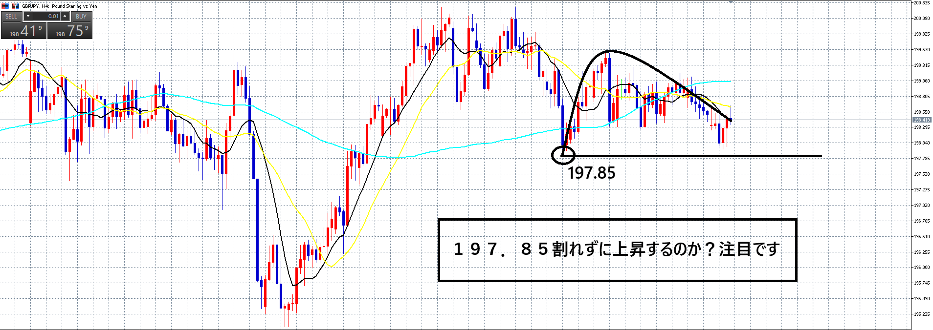 ポンド円が先行して下落しているので、197.85割れるのか?